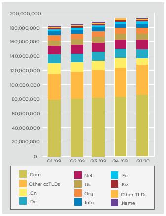 (1) A finales del primer trimestre de 2010 hay 193 millones de dominios registrados. Esto supone 1 millón más de dominios que a finales de 2009. Supone una clara ralentización en el incremento del número de dominios registrados, ya que en el trimestre homólogo de 2009 hubo 6 millones más de dominios que en el anterior trimestre. El descenso en el número de dominios de ccTLDs, en concreto de los dominios .cn de China, ha sido el responsable.