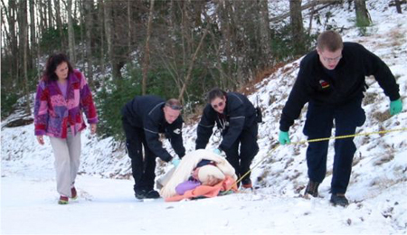A finales de 2004, cuando ya podía salir de la cama, resbaló en el hielo (en la foto el traslado) y se rompió la pierna en cinco partes. Otros 6 meses de hospital, que aprovechó para hacer un poco de domaining. Vió que se iba a celebrar una conferencia T.R.A.F.F.I.C.en Las Vegas (Mayo 2005) y decidió ir. Desde entonces ha estado en todas, siendo conferenciante en algunas.
