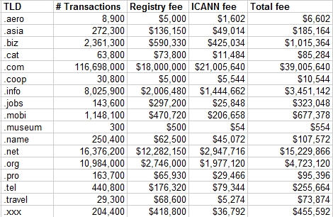 La ICANN ha publicado el 1 de Mayo, abriendo un periodo de comentario público, el borrador de sus cuentas previstas para el año 2013. Los ingresos esperados para los siguientes TLDs  están desglosados en tres campos: transacciones esperadas, tasa que se cobra al Registro y tasa de la ICANN por operación: