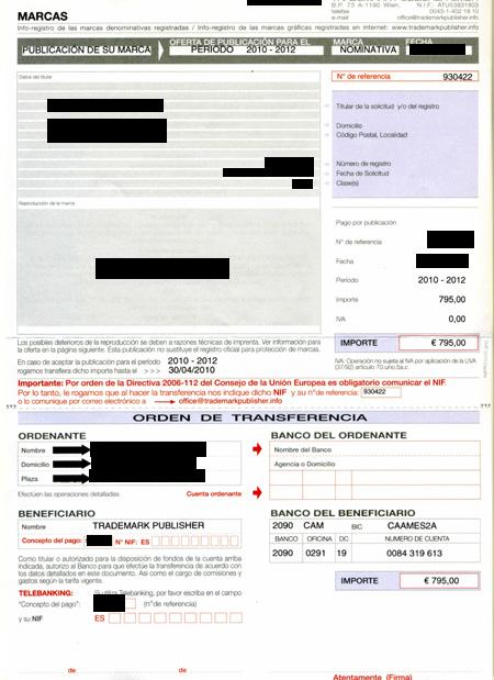 Se trata de la nueva remesa de 2011 de la vieja estafa de las marcas registradas, cuyo modus operandi es muy similar a la de los dominios recientemente publicada. Utilizando datos públicos, ya sea del whois o del registro de marcas, se envían cartas que intentan crear confusión, aunque una lectura atenta no deje lugar a dudas para no salirse de los bordes legales en los que operan estas empresas. La última hornada de cartas son EXACTAMENTE IGUALES (a excepción del número de cuenta bancaria, que lo han cambiado) a las que enviaron en Febrero de 2011: