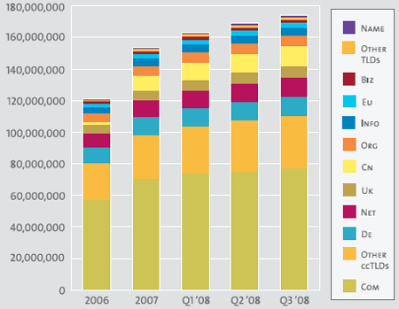 (1) A finales del tercer trimestre de 2008 hay 174 millones de dominios registrados. Esto supone 6 millones más de dominios que en el anterior trimestre. Es un crecimiento del 19% respecto del año pasado y un 3% respecto del anterior trimestre. Si bien estos pocentajes han descendido respecto del anterior trimestre, en valores absolutos han sido registrados 1 millón más de dominios, ya que en el segundo trimestre se registraron 5 millones de dominios más que en el primero.