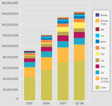 (1) A finales del primer trimestre de 2008 hay 162 millones de dominios registrados. Esto supone 9 millones más de dominios que en el anterior trimestre. Es un crecimiento del 26% respecto del año pasado y un 6% respecto del anterior trimestre..