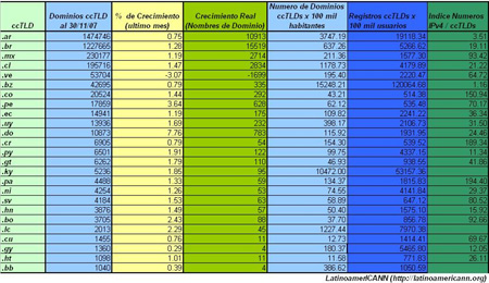 Las últimas estadísticas de dominios de Latinoamericann con las que se pretende medir la incidencia de políticas de Sociedad de la Información en el desarrollo de los ccTLDs de Latinoamérica arrojan los siguientes datos hasta el 30 de Noviembre de 2007.