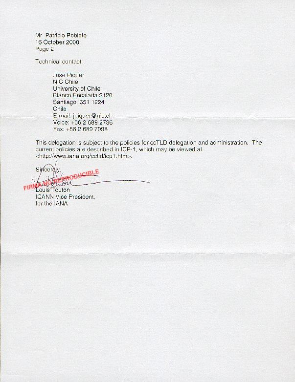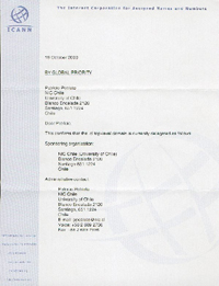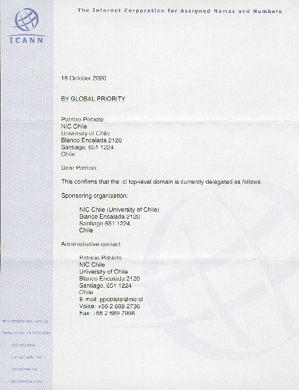 La ICANN delegó los dominios .cl de Chile al Departamento de Ciencias de la Computación de la centenaria Universidad de Chile, creada en 1842. No es algo que se suela ver a menudo, así que a continuación está el documento oficial de dos páginas que acredita esta delegación (pinchar para ampliarlo):