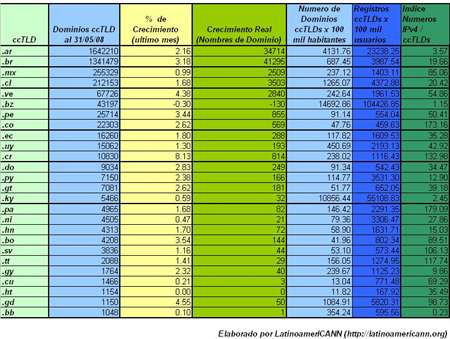 Las últimas estadísticas de dominios de Latinoamericann con las que se pretende medir la incidencia de políticas de Sociedad de la Información en el desarrollo de los ccTLDs de Latinoamérica arrojan los siguientes datos hasta el 31 de Mayo de 2008.