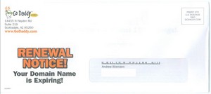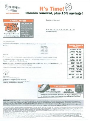 Andrew Allemann de DomainNameWire recibió hace poco una carta de GoDaddy, el mayor Agente Registrador del mundo. Era un aviso para la renovación de dominios.