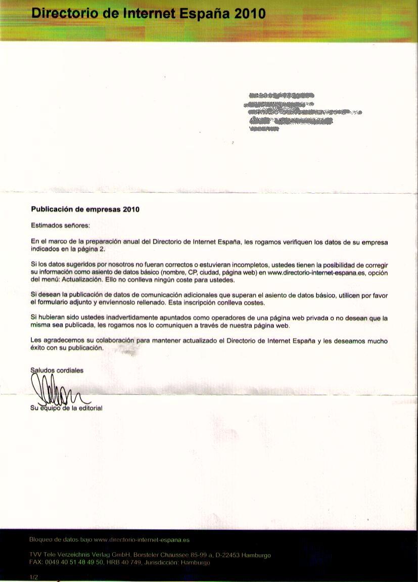 Ante la mala situación económica que atraviesa España, los hay que se aprovechan para estafar a empresas de todo tipo. Tal es el caso de Directorio de Internet España 2010. La vieja estafa viene de nuevo de la mano del estafador que lleva por nombre Uwe Evers con la empresa TVV Tele Verzeichnis Verlag GmbH