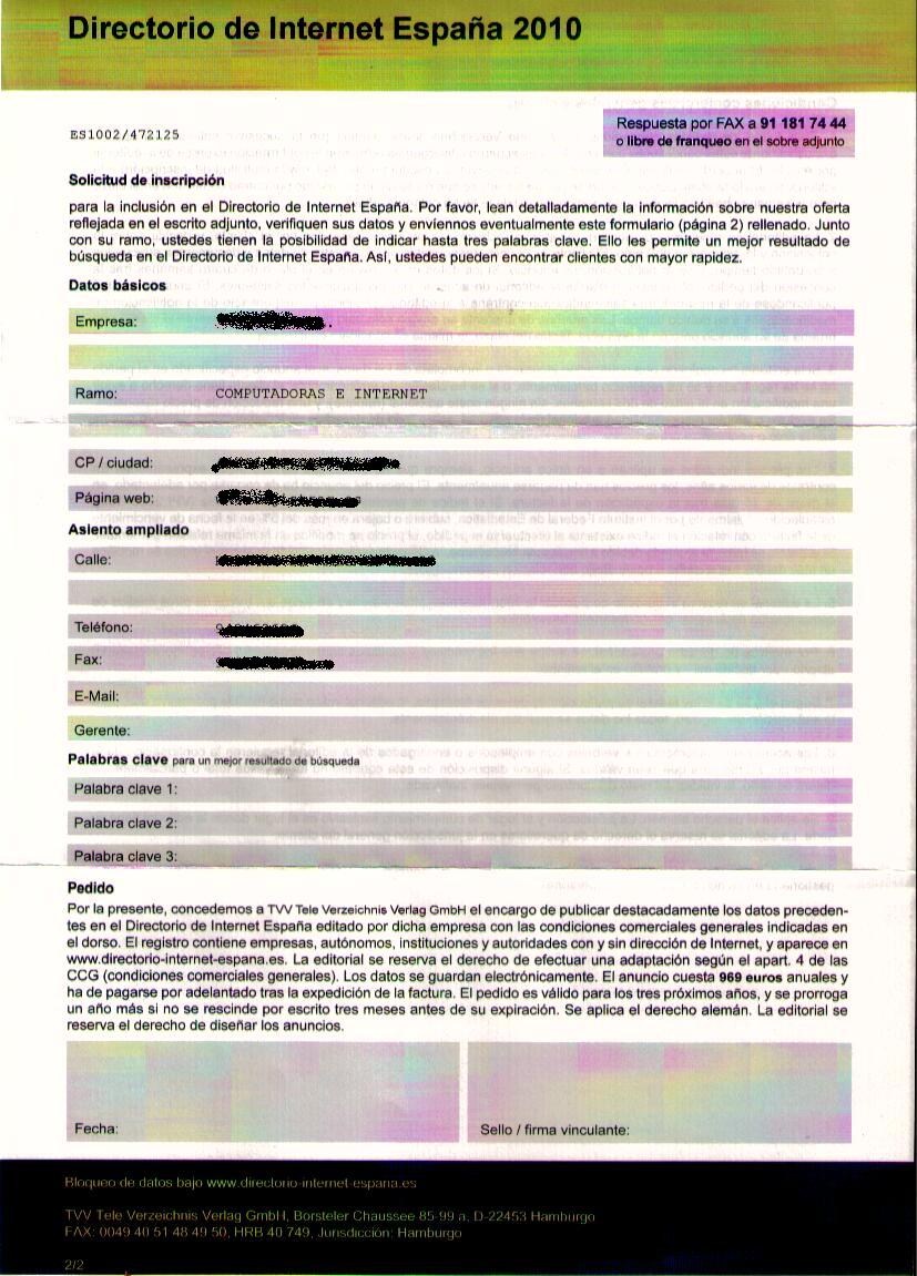 La estafa consite en que te ofrecen añadir tu empresa en el directorio www.directorio-internet-espana.es y cobrarte 969 euros al año. El valor añadido que ofrece la inclusión de tu empresa en www.directorio-internet-espana.es es nulo. No sirve para nada, pues se trata de una web cualquiera sin valor añadido ni posicionamiento reconocido. A esto se suma el precio más que abusivo de lo ofrecido.