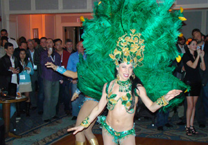.CO Internet SAS, que gestionará los dominios .co de Colombia, ofreció un cocktail y una cena en el Fairmont Miramar, incluyendo el show (ver video) con el grupo de samba (en la foto). También estuvieron presentes en el panel dedicado a los ccTLDs de T.R.A.F.F.I.C. Las Vegas 2010.