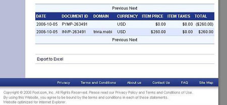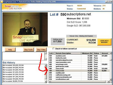 Así que puso esos dominios en su cuenta de Pool. Todos los dominios fueron a subasta. Centró su atención en fantastyfootball.mobi por el que llegó a pujar 10.000$, con la idea de ver una aplicación desarrollada en torno a ese nombre. Perdió la subasta. Desencantado estuvo a punto de irse, hasta que vió que quedaban 20 minutos para cerrar la subasta de trivia.mobi y las pujas andaban muy bajas. Pujó 200$, y después de otro escarceo más se llevó el dominio por $260: