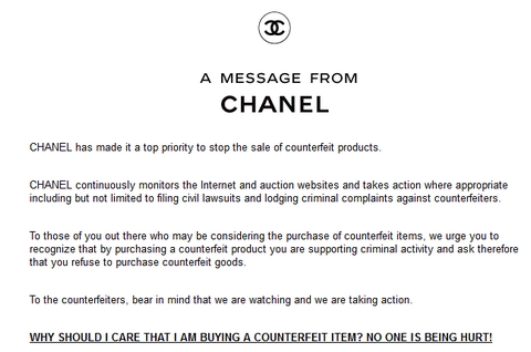 Es decir, advierte a los consumidores y ciberocupas que el dominio estaba siendo utilizado para vender falsificaciones de Chanel, que la web genuina de Chanel es Chanel.com y que la empresa monitoriza continuamente webs parecidas para tomar acciones legales para defender su marca, com en este caso.