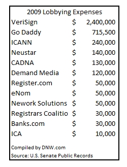 Empresas directamente relacionadas con la industria de los dominios y otras con intereses en dominios se han gastado durante 2009 4 millones de dólares en lobbys o grupos de presión del Congreso de los Estados Unidos.