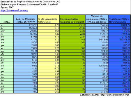Hace escasos 2 días Eric Iriarte de Latinoamericann informaba a Domisfera de los últimos datos de los ccTLDs de Latinoamérica hasta el 31 de Agosto de 2007.