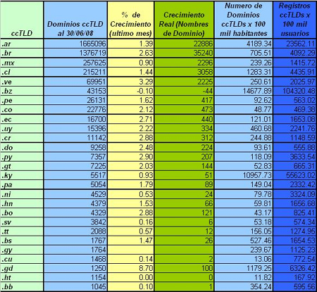 Las últimas estadísticas de dominios de Latinoamericann con las que se pretende medir la incidencia de políticas de Sociedad de la Información en el desarrollo de los ccTLDs de Latinoamérica arrojan los siguientes datos hasta el 30 de Junio de 2008.