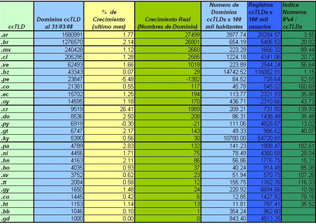 Las últimas estadísticas de dominios de Latinoamericann con las que se pretende medir la incidencia de políticas de Sociedad de la Información en el desarrollo de los ccTLDs de Latinoamérica arrojan los siguientes datos hasta el 30 de Marzo de 2008.