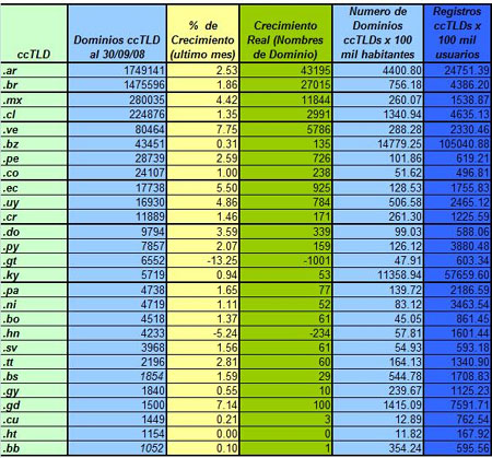 Las últimas estadísticas de dominios de Latinoamericann con las que se pretende medir la incidencia de políticas de Sociedad de la Información en el desarrollo de los ccTLDs de Latinoamérica arrojan los siguientes datos hasta el 31 de Septiembre de 2008.