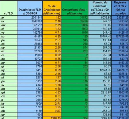 Los ccTLDs que presentaron mayor crecimiento porcentual fueron: Anguila .ai (1.348,15%), San Vicente y las Granadinas .gd (4.53%) y México .mx (2,79%).