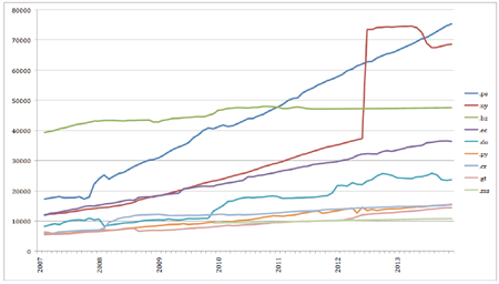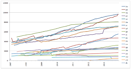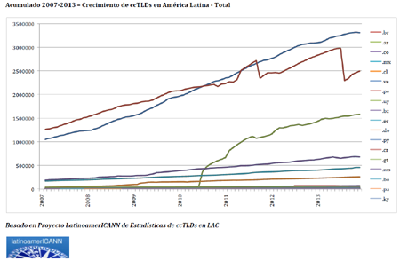Erick Iriarte Ahón nos suministraba las siguientes gráficas que reflejan el número de dominios registrados en ccTLDs de Latinoamérica del 2007 Actualmente hay en la región 9.18 millones de dominios registrados (2007 2,87 millones, 2008 3,49 millones, 2009 4,24 millones, 2010 5,19 millones, 2011 6,70 millones, 2012 7,94 millones).