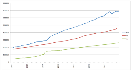 En la siguiente están los tres ccTLDs que superan los 100.000 dominios pero no llegan al millón. .cl Chile y .ve Venezuela tienen un crecimiento similar y sostenido mientras que los .mx tienen un crecimiento algo mayor, además de liderar el grupo: