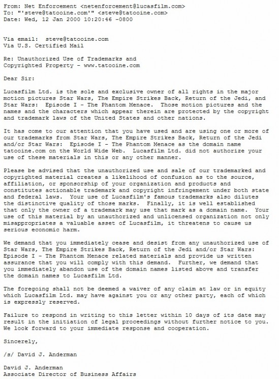 Tampoco a las cartas reclamando dominios, como por ejemplo la siguiente en que exigen el dominio tatooine.com a Steve Mount en base a sus marcas registradas (y que acabaron consiguiendo):