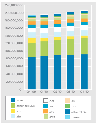 (1) A finales del cuarto trimestre de 2010 hay 205,3 millones de dominios registrados. Esto supone 3,5 millones más de dominios que en el anterior trimestre y 12 millones más que en el mismo trimestre de 2009, un crecimiento del 6,25%.