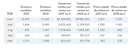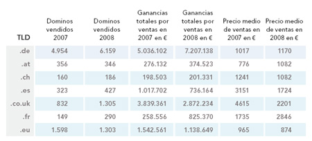 En los dominios .es se ha experimentado un aumento de en el número de dominios vendidos (de 323 en 2007 a 427 en 2008) con una bajada del precio medio de 3.151€ en 2007 a 1.724€ en 2008. El volumen total de ventas fue de 736.164€.