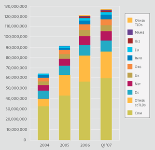 (1) Hay 128 millones de dominios registrados. En los primeros 3 meses de 2007 se han registrado unos 8 millones de dominios más (un promedio diario de 88.888). Durante el 2.006 hubo un promedio de 10,1 millones de registros de dominios por trimestre, a diferencia del promedio de 8,7 millones de registros nuevos que hubo en los trimestres de 2005. Así que la tasa de crecimiento sufre una ligera ralentización.