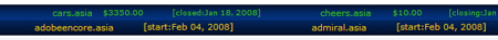 Sorprendentemente tyco.asia alcanzó los 7.600$, en cambio extra.asia sólo llegó a los 10$. Las subastas en curso (parliament.asia 5.200$, next.asia 1.050$, …) se pueden ver en vivo a través de un ticker en dotAsia.asia. Otros dominios que saldrán a subasta son marcas tan conocidas como levis.asia o iphone.asia.