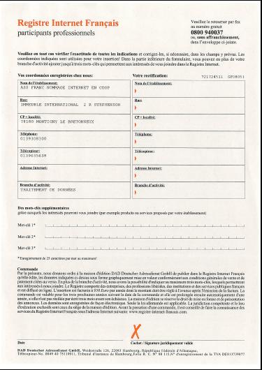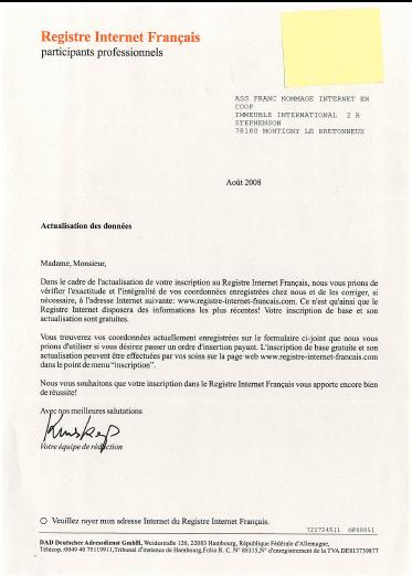 Ahora vuelve a ser noticia en Francia. El Registro de los dominios .fr AFNIC ha publicado una noticia en la que decía que durante varios meses ha estado recibiendo quejas de personas que habían recibido cartas del "Registre de l’Internet Français" ofreciendo un servicio enmascarado y no solicitado por un precio que oscilaba entre los 800 y 1.000€. Aparte de confirmar que no tienen ninguna relación con Deutscher Adressdienst GMBH hacen una referencia al interesante dossier que elaboraron en 2006 sobre este tipo de estafas.
