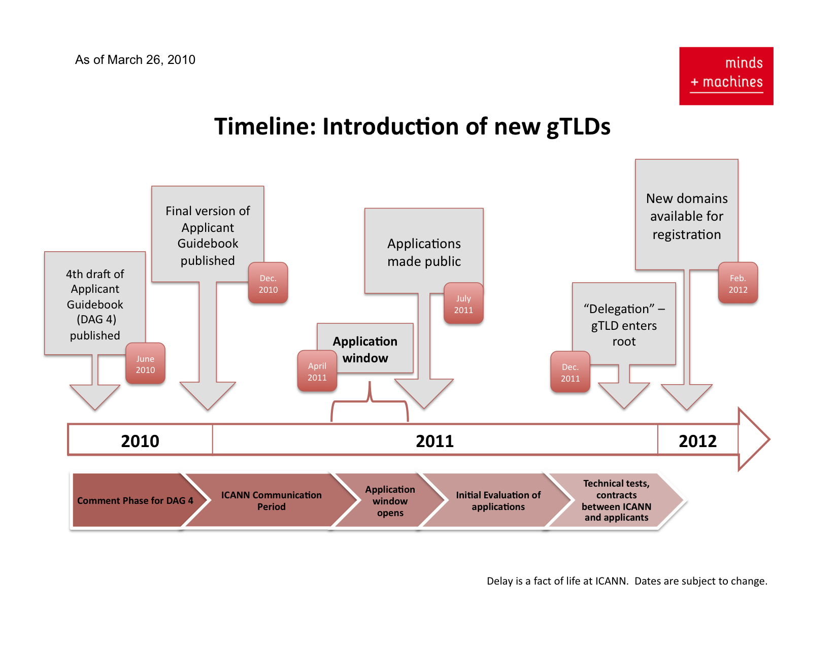 Según este calendario la cuarta versión del borrador de la Guía para la creación de Nuevas Extensiones podría estar listo para el periodo de comentario público en Junio de 2010 y la Guía final para Diciembre de este año.
