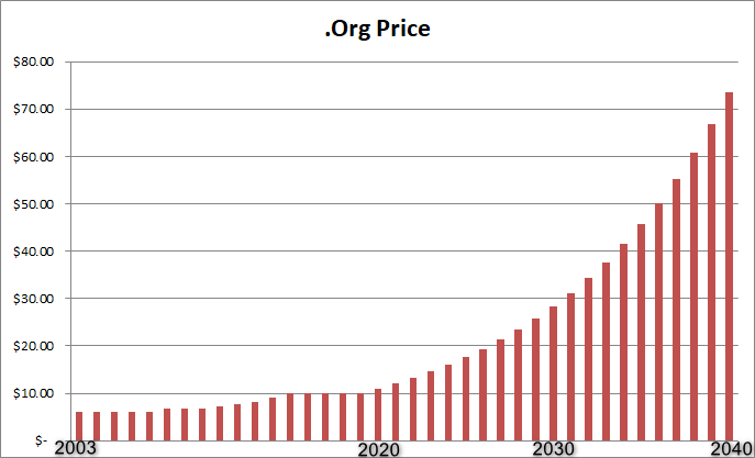 De haber subido un 10% anual todos los años, un dominio .org costaría ahora $20.71.