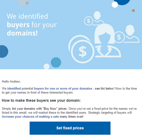 Durante estas semanas Sedo ha estado mandando mails como el de arriba. El objetivo es que el propietario y receptor del mail establezca un precio fijo para dominios en los que Sedo cree que hay potenciales compradores.