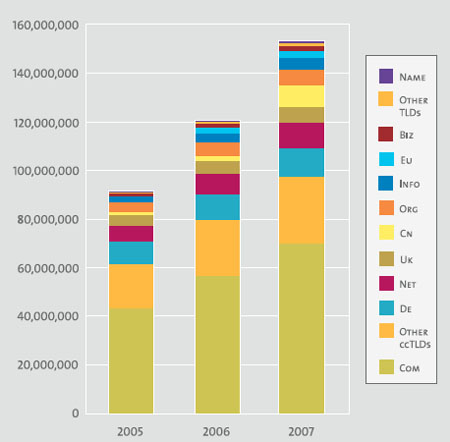(1) A finales de 2007 hay 153 millones de dominios registrados. En el cuarto trimestre del año, se registraron 7 millones más de dominios. Esto representa un millón menos que en el trimestre anterior y 3 millones menos que el segundo trimestre. Este descenso es estacional y coincide con las vacaciones fin de año (¿desconectan los domainers?). Durante todo el 2007 se registraron 33 millones de dominios más que en 2006.