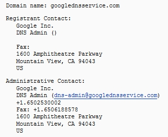 Es relativamente sencillo para cualquiera hacer spoofing o suplantación de identidad en los datos del whois. Aparentemente el dominio GoogleDNSService.com es de Google: