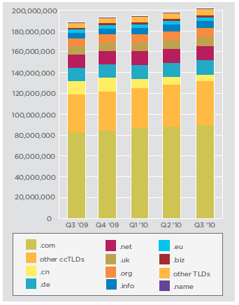 (1) A finales del tercer trimestre de 2010 hay 201,81 millones de dominios registrados. Esto supone 5,5 millones más de dominios que en el anterior trimestre. Supone 13,3 millones más que en el mismo trimestre de 2009, un crecimiento del 7%.